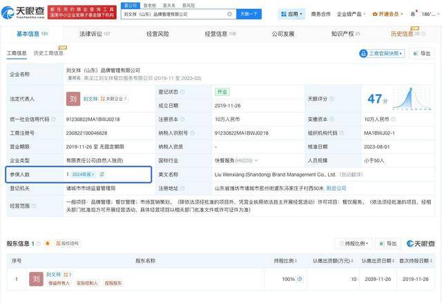 天眼查App显示,刘文祥麻辣烫关联公(gong)司刘文祥(山东(dong))品牌管理有限公(gong)司成立于2019年11月,法定代表工资刘文祥,注册资本10万人民币,经营局限为品牌管理、餐饮管理、市场营销谋划、餐饮服务。股东(dong)信息显示,该公(gong)司由刘文祥全资持股。年报信息显示,该公(gong)司2023年、2024年参保人数(shu)为1。