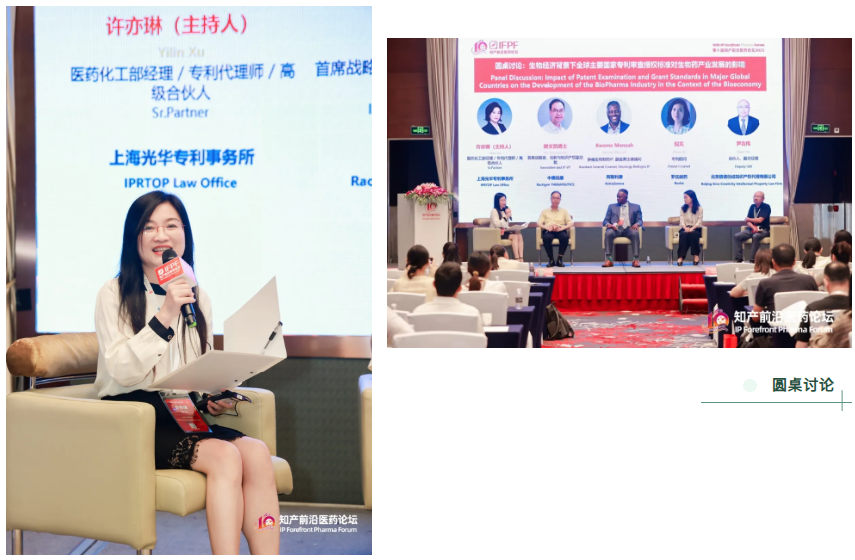 在9月17日上午的研讨会上,光华所医药化工·高级合伙人、资深专利代理师、律师许亦琳受邀担任圆桌讨论主持人,围绕“生物经济背景下全球主要国家专利审查授权标准对生物药产业发展的影响”这一前沿议题,同来自不同国家和地区的知识产权专家、法律顾问、药企代表,就“如何获得生物序列的合理专利保护范围、中美欧日韩主要国家审查标准的差异点、大分子药物 FTO 如何选择序列数据库”等热点问题展开了深入交流。整场圆桌讨论气氛热烈、内容丰富,赢得了与会嘉宾与观众的高度评价。