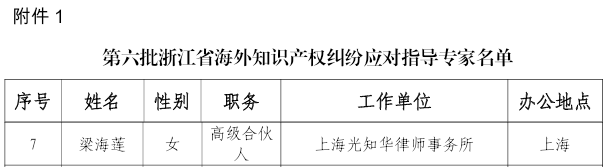 近日,浙江省知识产权保护中心公布第六批浙江省海外知识产权纠纷应对指导专家名单,上海光知华律师事务所律师、专利代理师梁海莲凭借深厚的专业造诣与丰富的实务经验成功入选。